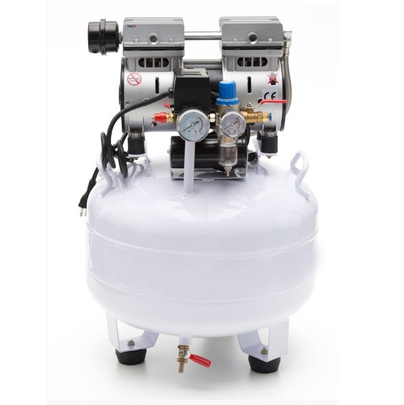 Compressor Odontológico para 1 consultório, com funcionamento à pistão isento de óleo para uso clínico, laboratorial, comercial, ou residencial. Atende consultórios com capacidade máxima de fornecimento de ar (vazão) em 85 litros por minutos, possui reservatório de ar com pintura interna antibacteriana. Protetor térmico contra sobreaquecimento de 110ºC, com pressostato, chave geral liga/desliga e válvula de segurança para alívio do excesso de pressão. Dreno na parte inferior do reservatório. Amortecedores anti-vibração e filtros na entrada e saída de ar.