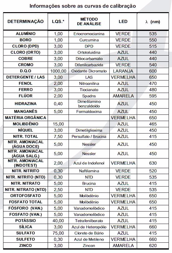 Curvas de calibração pré-programadas: Alumínio, Amônia (Indotest), Boro, Cloro DPD (Baixa), Cloro OTA, Cobre, Cromo, Detergente (LAS), DQO Efluentes, Fenol, Ferro Total, II e III, Ferro Tiofer, Flúor, Fosfato Total (BC), Fosfato Total (AC), Hidrazina, Manganês, Matéria Orgânica (Solo), Molibdênio, Nitrato, Nitrato NTD, Nitrito, Nitrito NTD, Nitrogênio Total (Digestão-Nitrato), Ortofosfato (BC), Fósforo (P, PO4 e P2O5) Vanadomolíbdico, Potássio, Sílica (BC), Sulfato, Sulfeto e Zinco.
